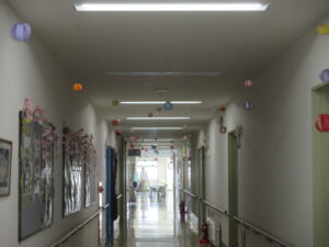 会場につながる一階の廊下も桜などで装飾しました。